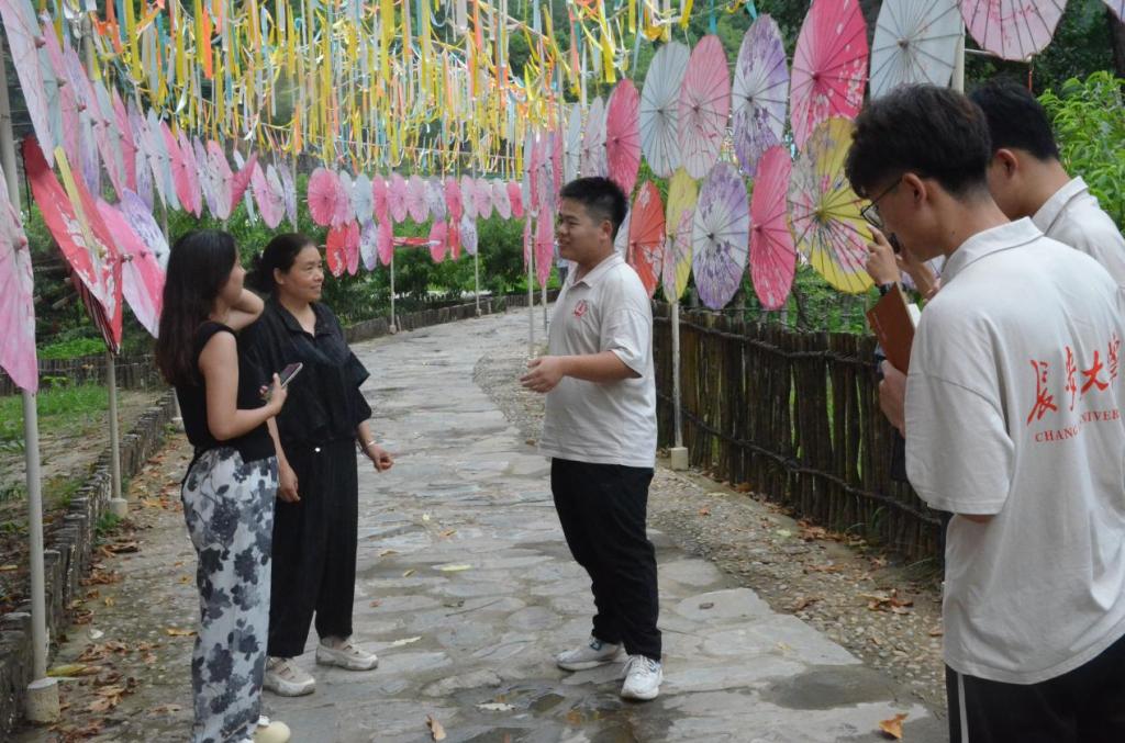 实践队首先前往商南县金丝峡镇二郎庙村,该村坐落于秦岭南麓武关河下游,自然风光旖旎。党的十八大以来,二郎庙村紧跟国家发展战略,依托金丝峡5A级景区,大力发展香菇、茶叶、中华蜂养殖等产业,与此同时,新建“山也椅子”民宿露营地,新兴发展美丽乡村生态旅游业,实现了乡村旅游与农业产业的互促互融。2020年,二郎庙村实现整体脱贫摘帽,贫困户全部脱贫。先后获得了省级旅游示范村、省级美丽宜居示范村、市级“文明村”、市级产业脱贫先进示范村等多项殊荣,成为乡村振兴战略的生动实践和典范。