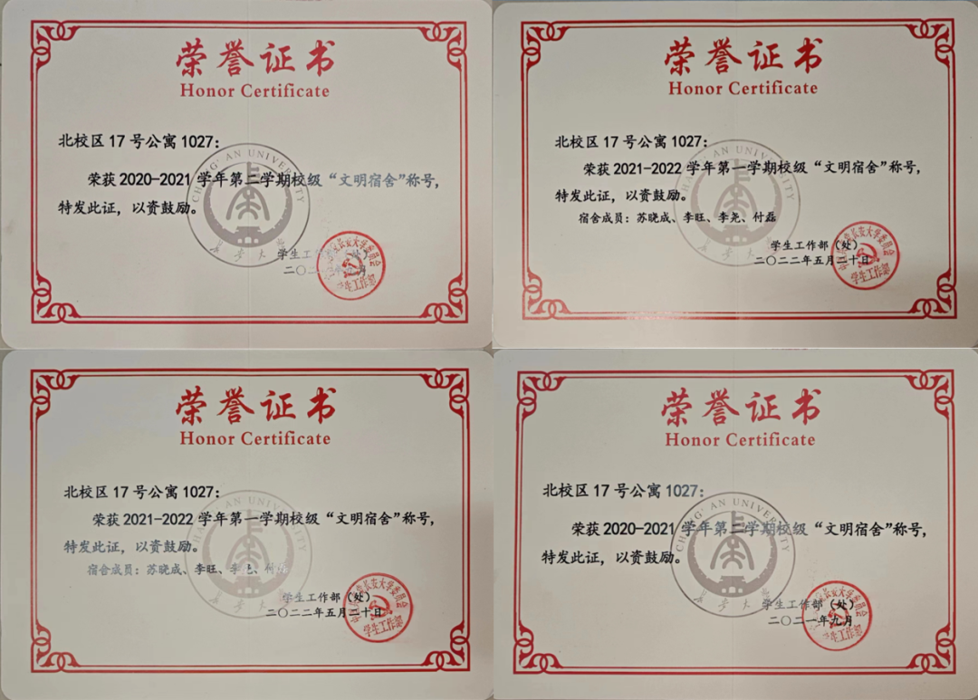 在大学期间的集体宿舍学习中,尽管我们来自不同的民族,但我们始终努力奋进,潜心学习、钻研讨论,共同进步,经过三年的努力,宿舍三人获得推免资格,所获奖学金累计4.5万余元;我们亦师亦友初试科创、共同进步,宿舍成员负责六项大学生创新创业训练计划,六项大创全部结项,其中一项评为优秀。另外,宿舍各个成员思想觉悟高,尊敬师长,荣获校级“优秀共青团员”,校级“优秀共青团干部”等荣誉称号;宿舍成员奉献自我,在疫情期间获得参加各项志愿活动累计志愿时长100多小时;我们投身实践,曾前往多家公司进行实习,多次获得“暑期社会实践优秀成果”、“暑期社会实践省级标兵团队”、“暑期社会实践优秀个人”等。除此之外,宿舍成员热爱文体活动,强健体魄,体测通过率100%,荣获文体类竞赛奖项10余项。截止目前,宿舍成员累计奖项及荣誉称号共100余项,其中,国际奖项一项,国家级奖项4项、省级奖项8项。
