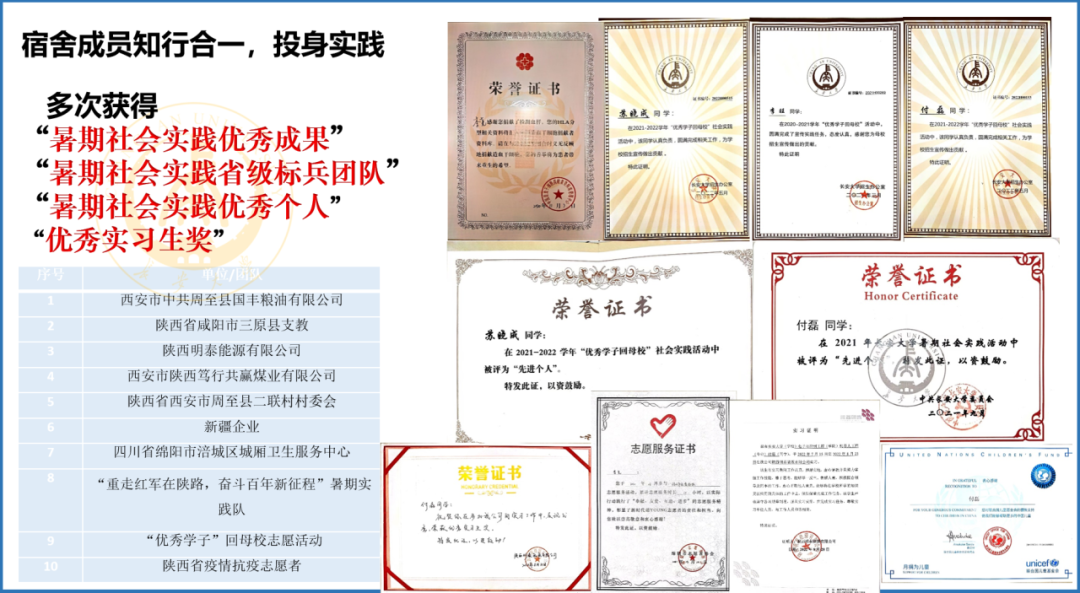 宿舍成员一心向党,争做先锋,成为学院第一批“党员示范宿舍”,入党申请书提交率100%,连续三年获得校级文明宿舍。宿舍成员积极为同学服务有三人担任班级班长,一人担任班级综合委员,在各自的岗位上尽心尽责。在五四评优中获得“优秀共青团员”等荣誉称号。