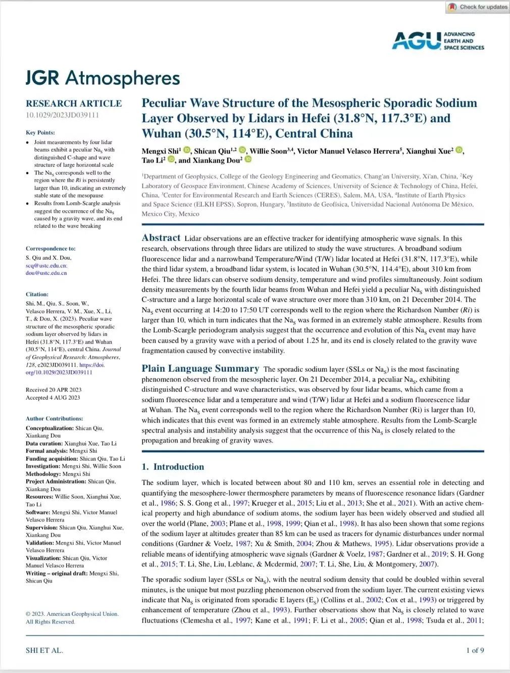 依托国家自然科学基金面上项目(基于子午工程激光雷达的突发钠层新机制研究),他以第一作者在《Journal of Geophysical Research: Atmospheres》上发表了题为“Peculiar Wave Structure of the Mesospheric Sporadic Sodium Layer Observed by Lidars in Hefei (31.8°N, 117.3°E) and Wuhan (30.5°N, 114°E), Central China”的学术论文, 《JGR: Atmosphere》是地学领域高质量科技期刊分级T1期刊、自然指数(Nature Index,NI)选取的68种世界一流科技期刊之一,是中国科学院二区TOP期刊,JCR分区一区期刊。