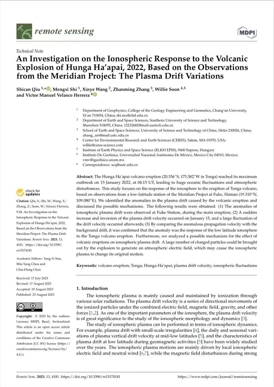 在地质活动的电离层响应研究,中央高校基本科研业务费专项资金项目(基于子午工程的汤加火山爆发对近地空间环境的影响研究)的支持下,他在地学领域高质量科技期刊分级T1期刊、中国科学院二区top期刊《Remote Sensing》发表了相关的科研成果。