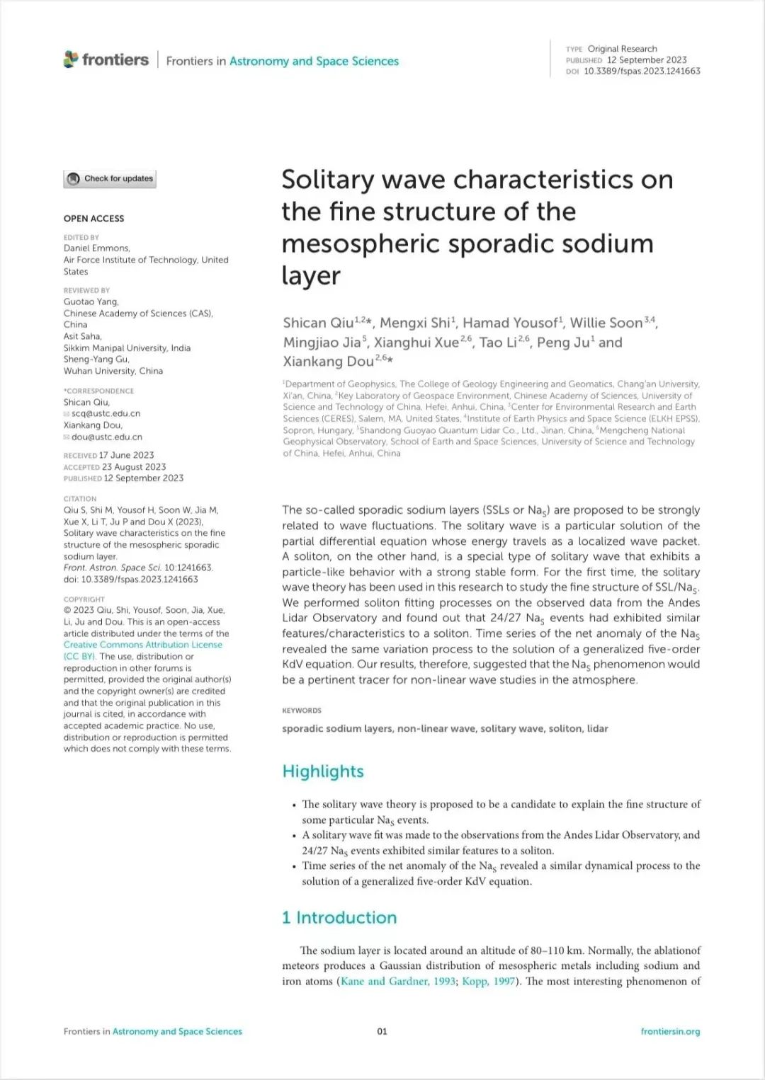 他在中国科学院三区期刊《Frontiers in Astronomy and Space Sciences》上发表的论文首次提出孤立波可能是突发钠层的成因的观点。
