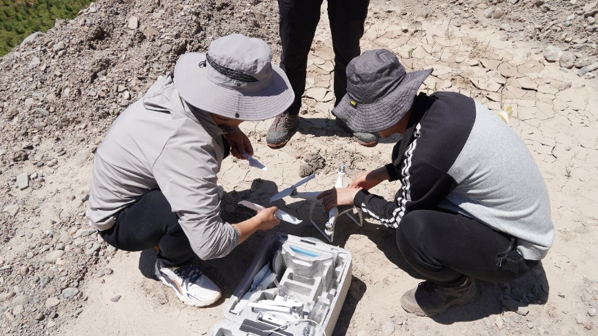 庄建琦教授向队员们介绍了军功滑坡的地质构造以及现今活动状态,并进一步和队员们讨论了滑坡复活的诱发因素。科考队周子杰博士对军功滑坡的滑动面积、体积、地层岩性等滑坡背景进行了补充。之后,社会实践队员杜建涛博士操控无人机对军功滑坡进行航拍数据采集。