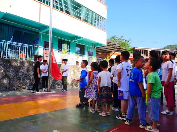 筑梦黔行队与30余位孩子们进行了庄严的升旗仪式。迎着支教课程开始的第一缕晨光,升旗仪式正式开始,旗杆旁,色色啦