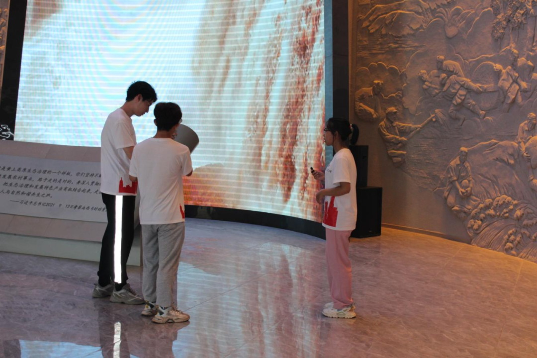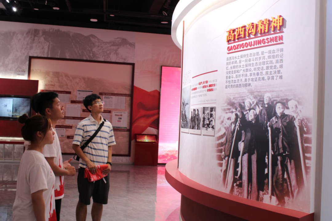 卓越的生态治理成果离不开党的领导。在红色堡垒厅,实践队员们了解到自新中国成立以来,高西沟村先后产生了四任党支部班子。从第一任开始,高西沟村党支部就在治理穷山恶水的壮举中逐渐形成不屈不挠、敢教日月换新天的雄心壮志和必胜信念,培养了精诚团结、奋发图强、特别能吃苦、特别能战斗、特别能奉献的过硬作风,并在班子新老交替中传承和发扬,成为“黄土高原上薪火相传的红色战斗堡垒”。同时,实践队员们通过讲解员的讲解,也对“坚持不懈、与时俱进、协调发展”的新时代高西沟精神有了更加深刻的理解。