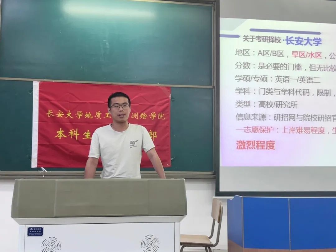 接下来,陈炫博同学以提前准备为主题,以自身经验为基础,从志愿选取,报考类型,以及调剂方法等方面给出了同学们建议,鼓励同学们早做准备,确定目标,在备考过程中,有的放矢。