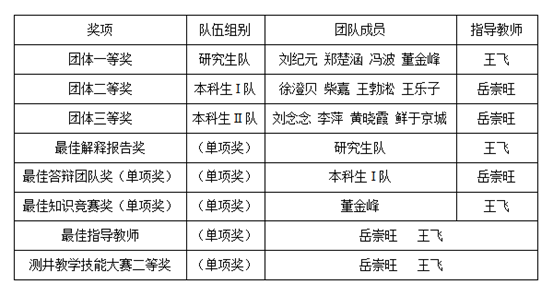 地球物理系师生代表荣获团体一等奖、二等奖、三等奖各1项,获最佳解释报告奖等单项奖3项。岳崇旺、王飞老师分别荣获优秀指导教师。在同期举办的第二届全国青年教师测井教学技能大赛中岳崇旺、王飞老师分别获得二等奖。
