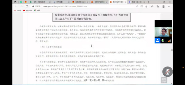 会议伊始,由苗行生老师带领同学学习《新时代的中国青年》白皮书的相关内容。白皮书全面介绍了新时代党和政府为青年发展创造的良好条件、取得的巨大成就,充分展现了新时代中国青年奋进新征程、建功新时代的青春担当,是一部记录新时代中国青年发展事业成果、反映新时代中国青年精神风貌的重要文献。