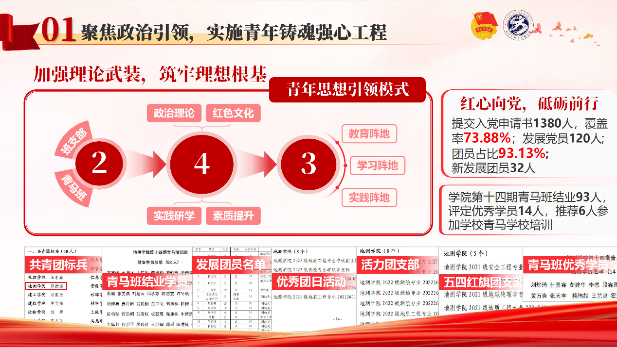 团委主持搭建“2-4-3”青年思想引领模式。主抓“团支部、青马班”两大主体基础,完善落实“政治理论+红色文化+实践研学+素质提升”四大教育助手,积极用好“教育阵地、学习阵地、实践阵地”三大载体,学习贯彻习近平总书记关于青年工作的重要思想,搭建团员青年学习场域。在文化宣传上,构建以微信、短视频为主体的青年工作新媒体矩阵。年度“地测微天下”公众号发表680余篇推文,累计浏览量70余万,在年度校园新媒体评优中获得“新媒体十佳奖”等荣誉。