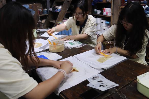 午后,实践队移步至当地蜡染坊,与蜡染坊工作人员进行访谈,蜡染坊已成为多民族协作的“纽带”。在各个环节中,各族群众分工协作,形成“利益共同体”,在文化层面,作坊每年举办“蜡染文化节”,各民族村民展示技艺、交流设计,共同创作“民族团结主题蜡染长卷”,用传统技艺讲述融合故事。
