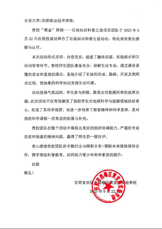 活动获得了积极反响,庆阳市西峰区黄官寨实验学校专门发来感谢信,对活动的组织成效与师生表现予以充分肯定。信中表示,本次活动“形式多样、内容充实、讲解生动专业”,使抽象的科学知识更易于理解,不仅激发了学生对地球科学与能源领域的兴趣,也有助于拓宽科学视野、培养探索精神与科学素养。来信特别提到,色色啦