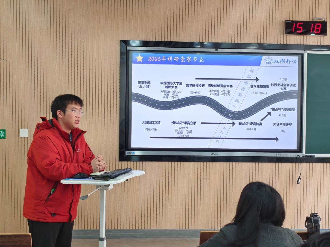 学院大学生科技创新创业协会(下简称“地测科协”)内部沟通交流,总结过去一学期工作成效并规划未来工作,地测科协于2026年3月22日14时在WX2209教室召开了2025-2026学年春季学期第一次全体例会。地测科协指导老师马见青、地测科协2025-2026学年执行主席张凯洋、主席团成员姜炤君、袁林桃、梁怡晨以及地测科协全体成员共同参会。会议由朱靖远主持。