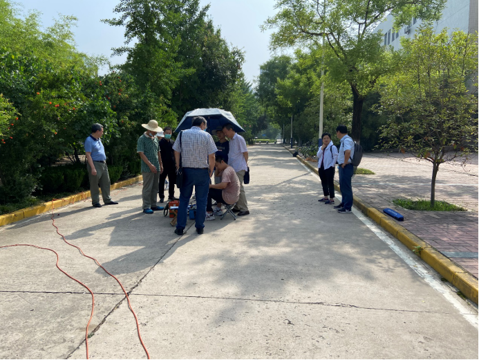 渭水校区地球物理系教学实习现场,分别在直流电法组、地磁重力组、地震勘探组、宽频带地震组和瞬变电磁组就学生对专业教学实习和实际生产应用中应该注意的问题,特别就实际勘探中方法选择的前提、实施方案设计、预算编制、数据采集参数选择、数据处理、报告编写等各个环节进行了交流和指导。同时,对就业和考研问题进行了交流和探讨。