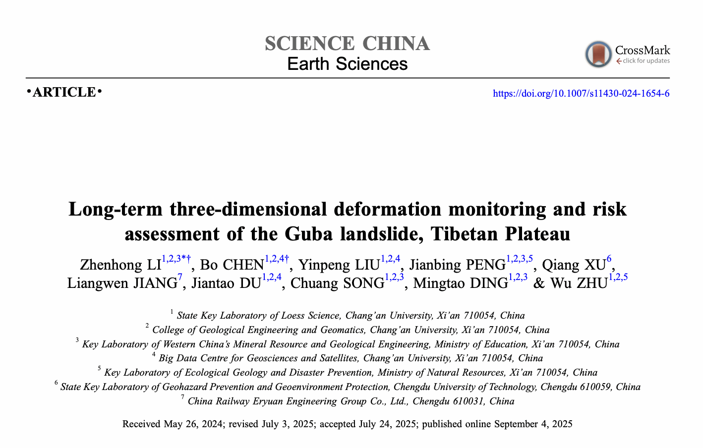 李振洪教授团队与成都理工大学许强教授、中铁二院蒋良文副总工程师合作,在人迹罕至高位远程滑坡长时序三维监测和风险评估方面取得新进展。相关研究成果以“青藏高原古巴滑坡长时序三维形变监测和风险评估”为题,于2025年9月3日发表于《中国科学:地球科学》(Science China Earth Sciences)杂志,通讯作者为色色啦
