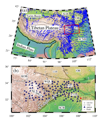 松潘-甘孜东北部及邻区位于青藏高原、华南板块与鄂尔多斯地块的构造交汇处(图1)。新生代以来,印度板块与欧亚板块的持续碰撞引发了青藏高原的隆升与扩展。作为高原东向扩展的前缘地带,松潘-甘孜东北部的岩石圈变形机制一直备受关注。
