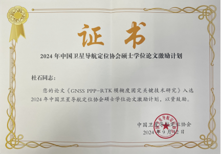 2022届硕士研究生杜石的学位论文《GNSS PPP-RTK模糊度固定关键技术研究》成功入选2024年度中国卫星导航定位协会硕士学位论文激励计划,指导老师为黄观文教授。
